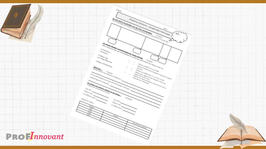 De même manière, dans cette évaluation, les élèves doivent démontrer leur capacité à placer les périodes historiques sur une frise chronologique et à associer chaque période avec les événements ou dates clés. Ils doivent également connaître les caractéristiques principales des périodes telles que la préhistoire, l’antiquité, le moyen âge, les temps modernes et l’époque contemporaine.