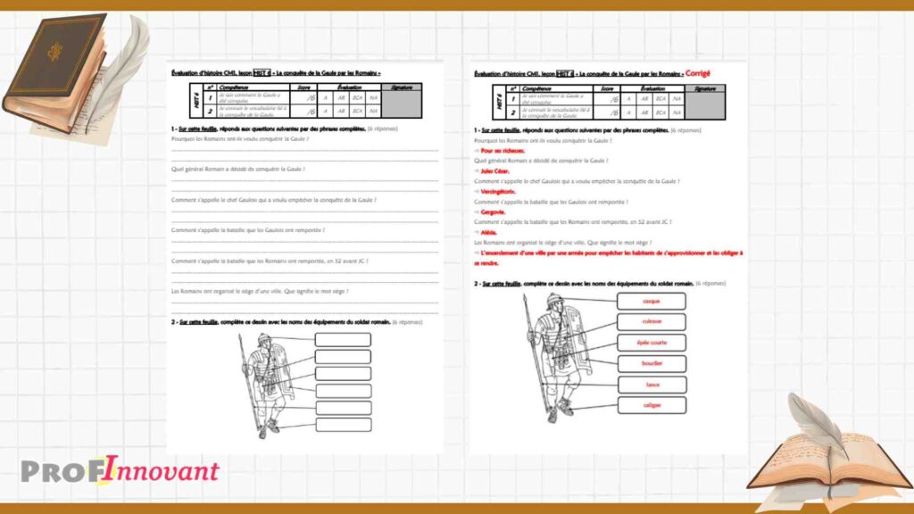 L’évaluation d’histoire pour les élèves de CM1 sur la conquête de la Gaule par les Romains examine leur compréhension des motivations romaines, des figures clés comme Jules César et Vercingétorix, ainsi que des batailles importantes telles que Gergovie et Alésia. Les élèves doivent répondre par des phrases complètes pour démontrer leur connaissance des événements historiques.
